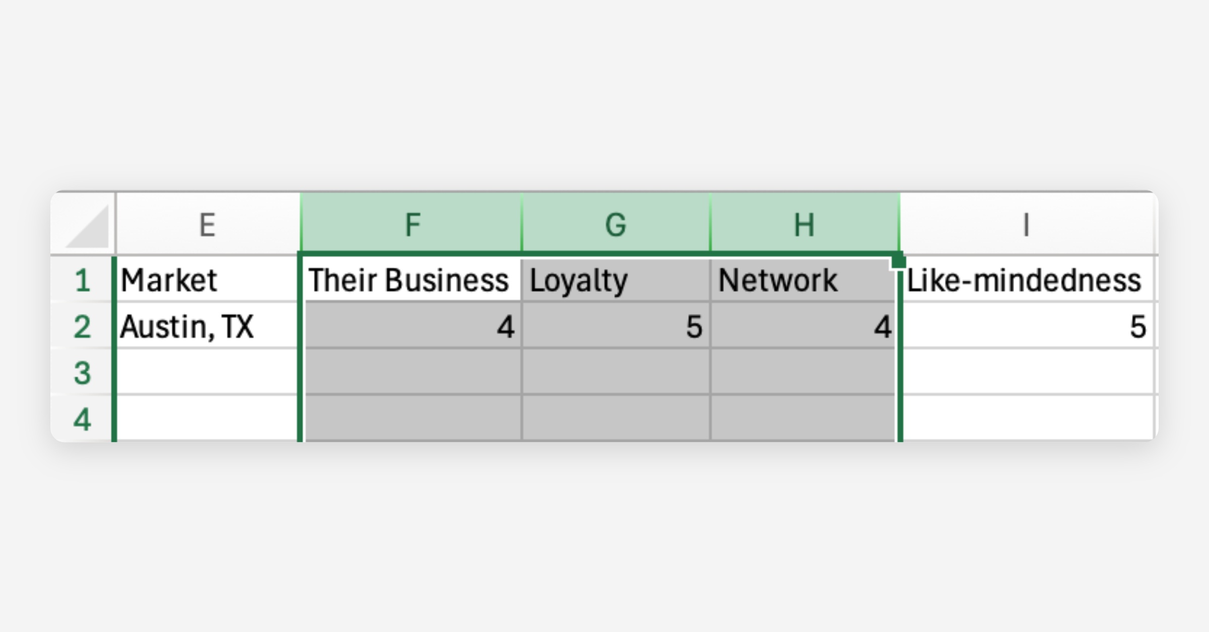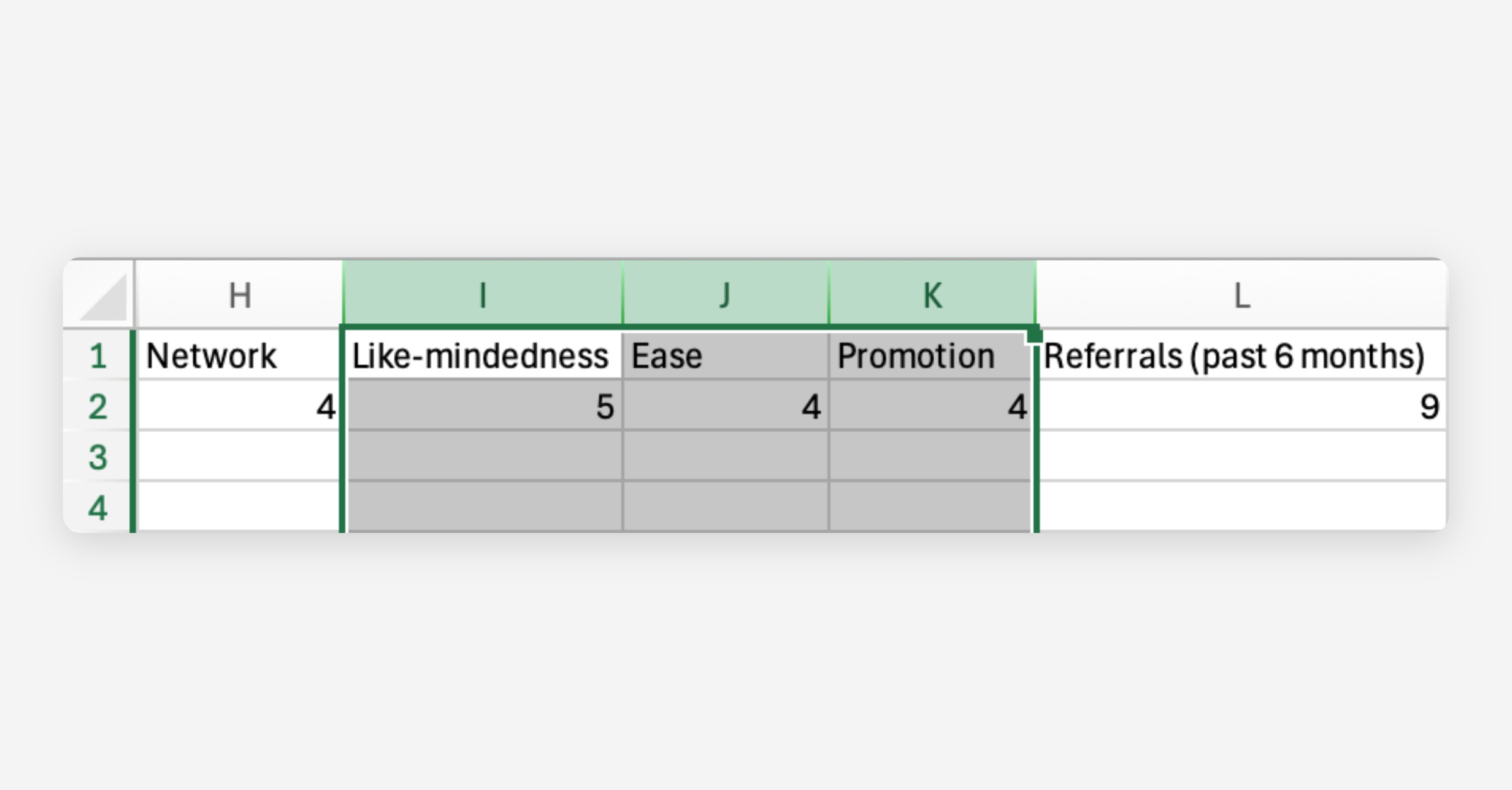 In the template, you'll see columns for your partnerships' potential (Their Business, Future Referrals, Future Volume) and health (Communication, Time & Attention, and Promotion).
