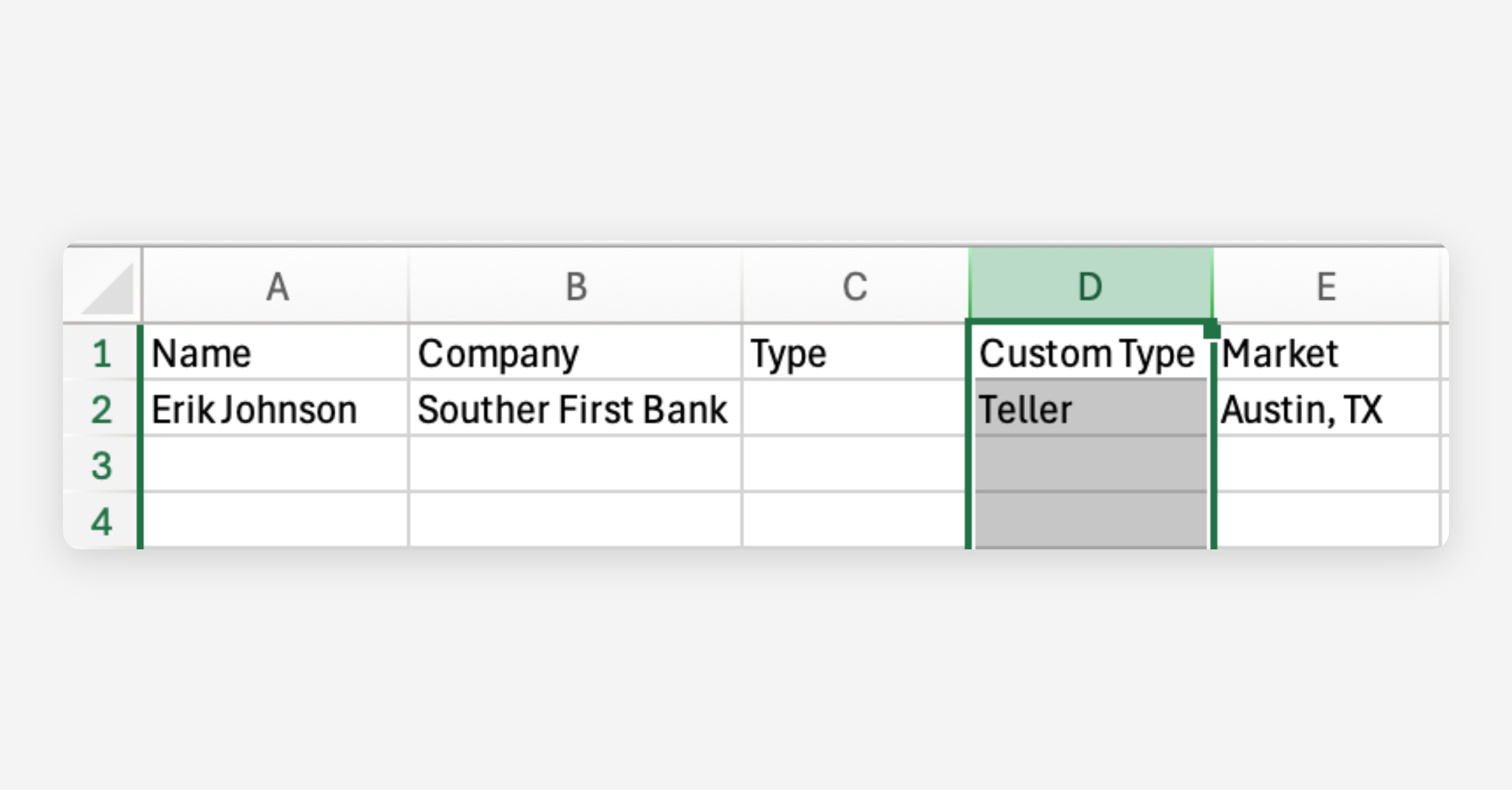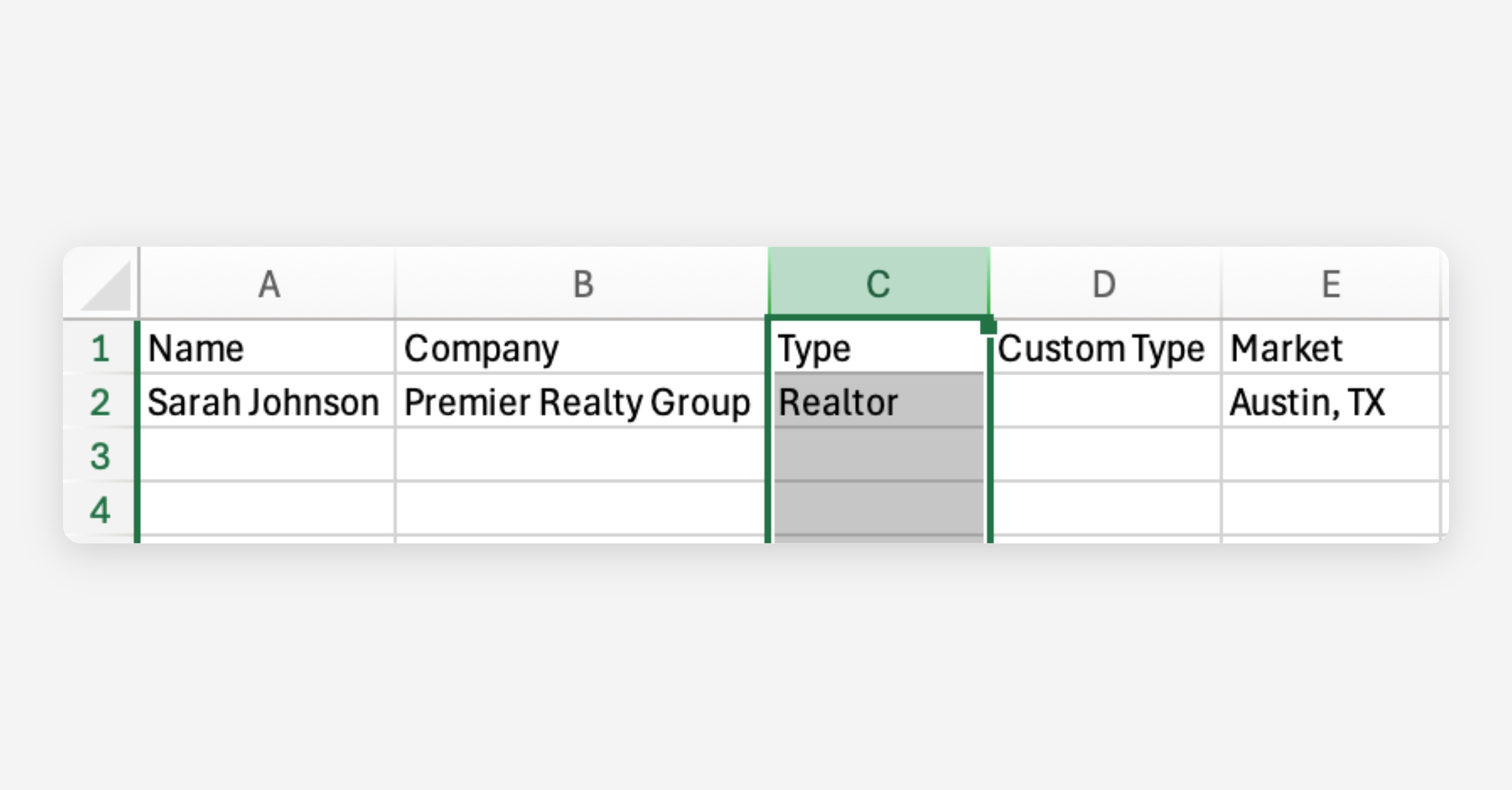 If you want to use a custom partner type (e.g., Teller, South Bend Branch, Highway Realty, etc.), enter your custom label into the Custom Type column.
