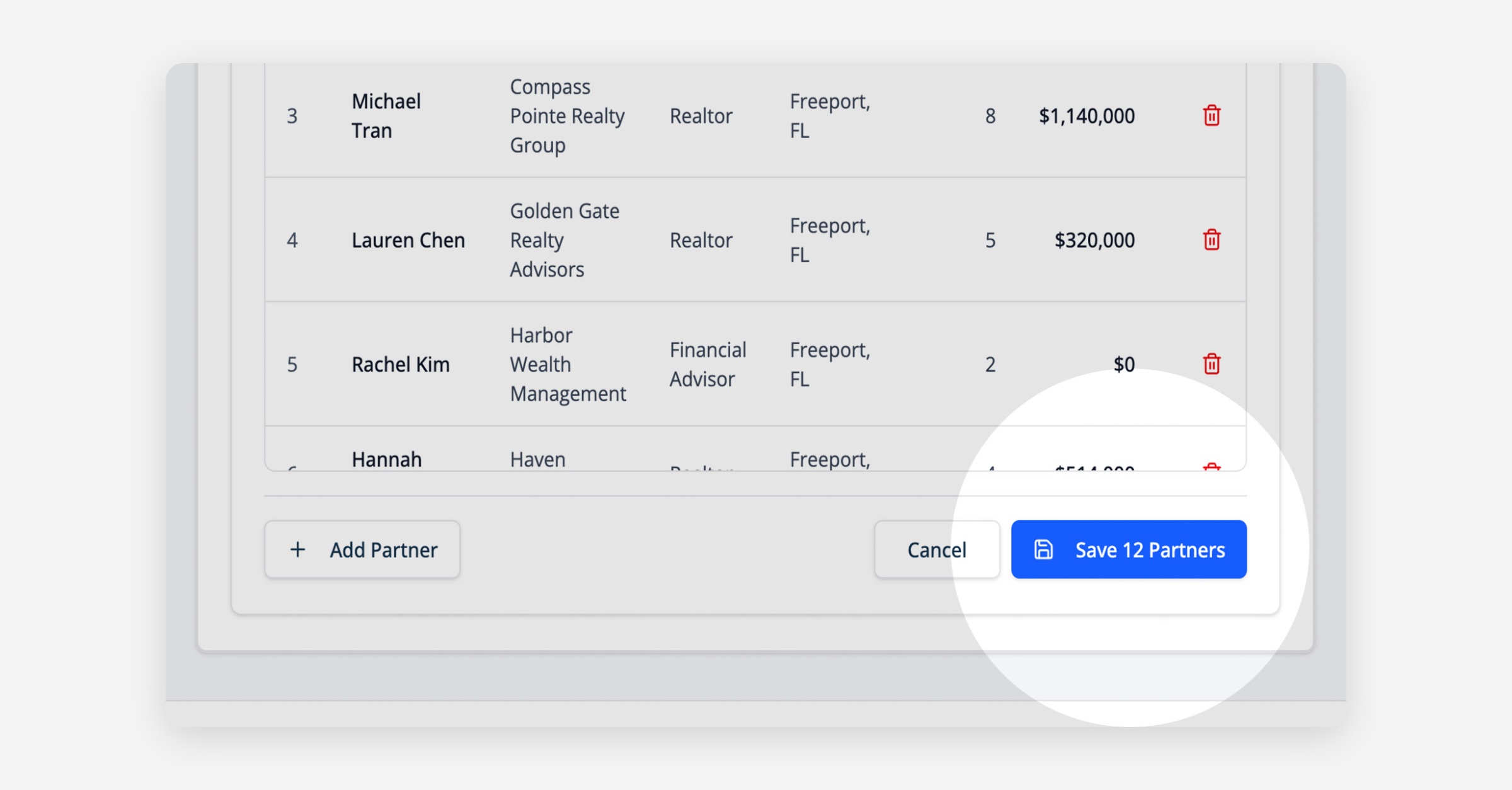 Add your partners' names, companies, types (details below), and market (e.g., Austin, TX)