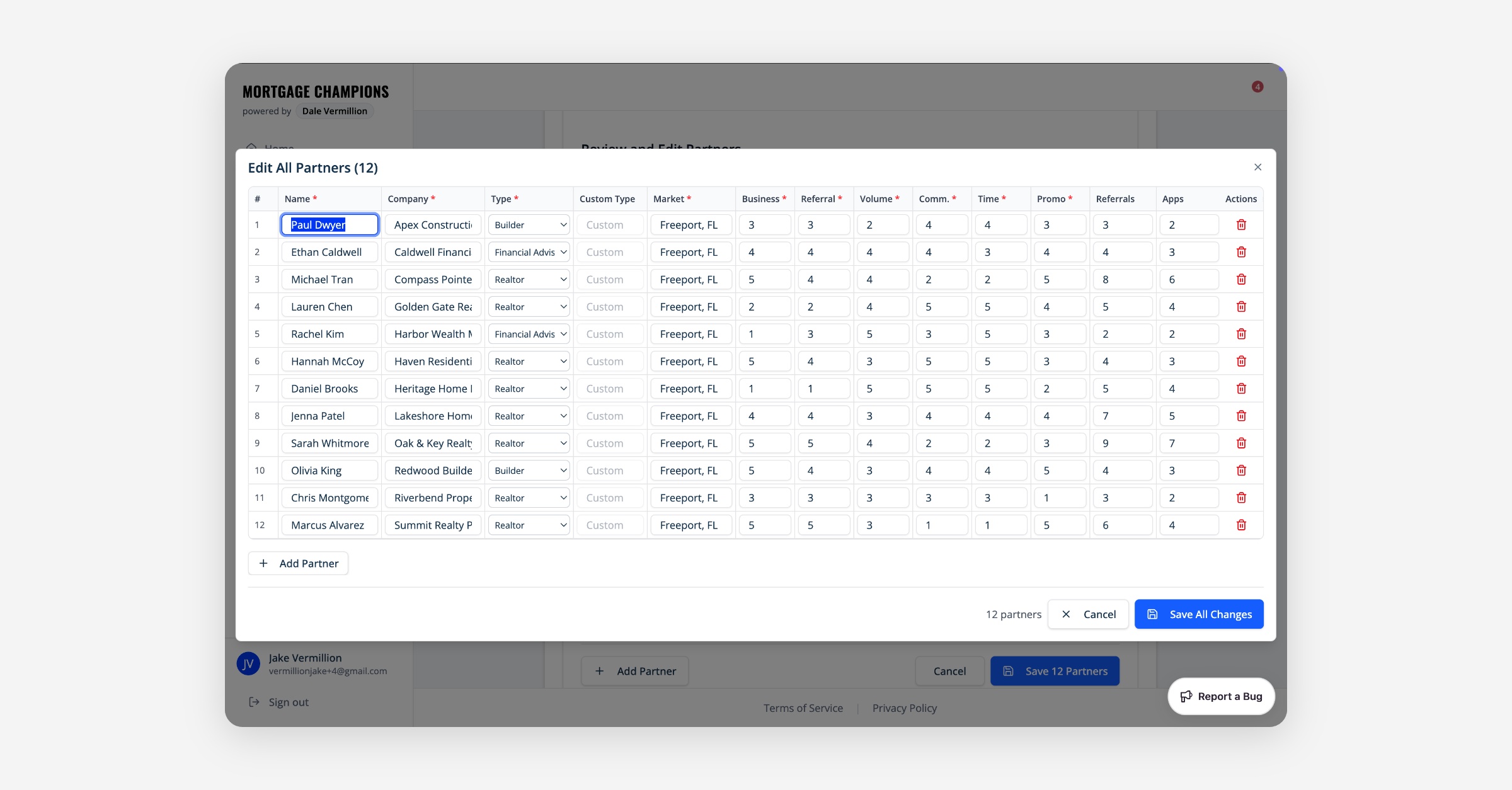 You can add and edit multiple partners. Simply download this template, fill-in your partners' data, and login into your account at app.mortgagechampions.com to upload.